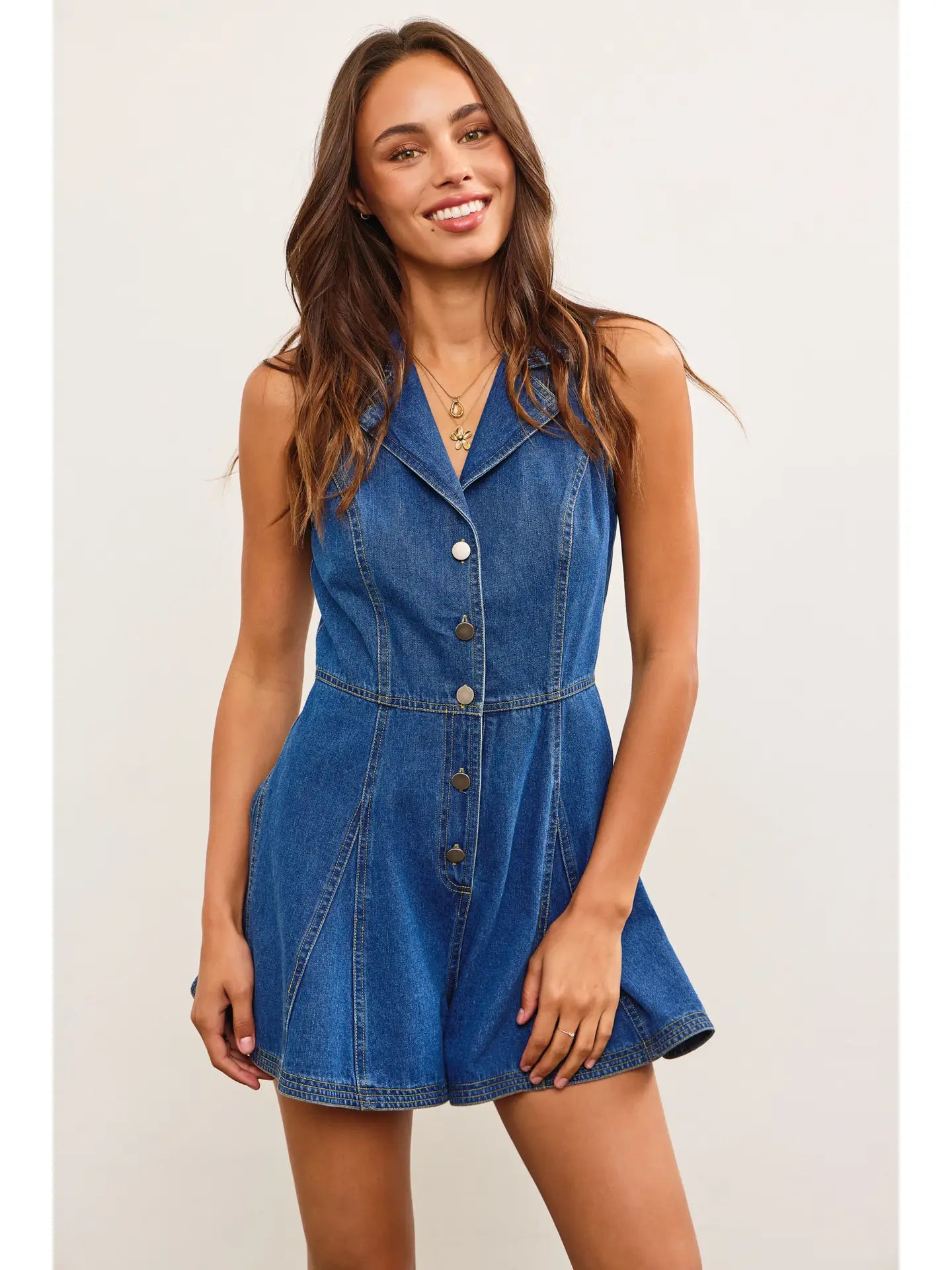 This sleeveless denim romper features a stylish lapel collar and playful flounce detailing, combining casual comfort with a touch of feminine flair. Perfect for warm days, its lightweight denim fabric offers breathability and ease of movement, making it an ideal choice for effortless, chic summer wear.