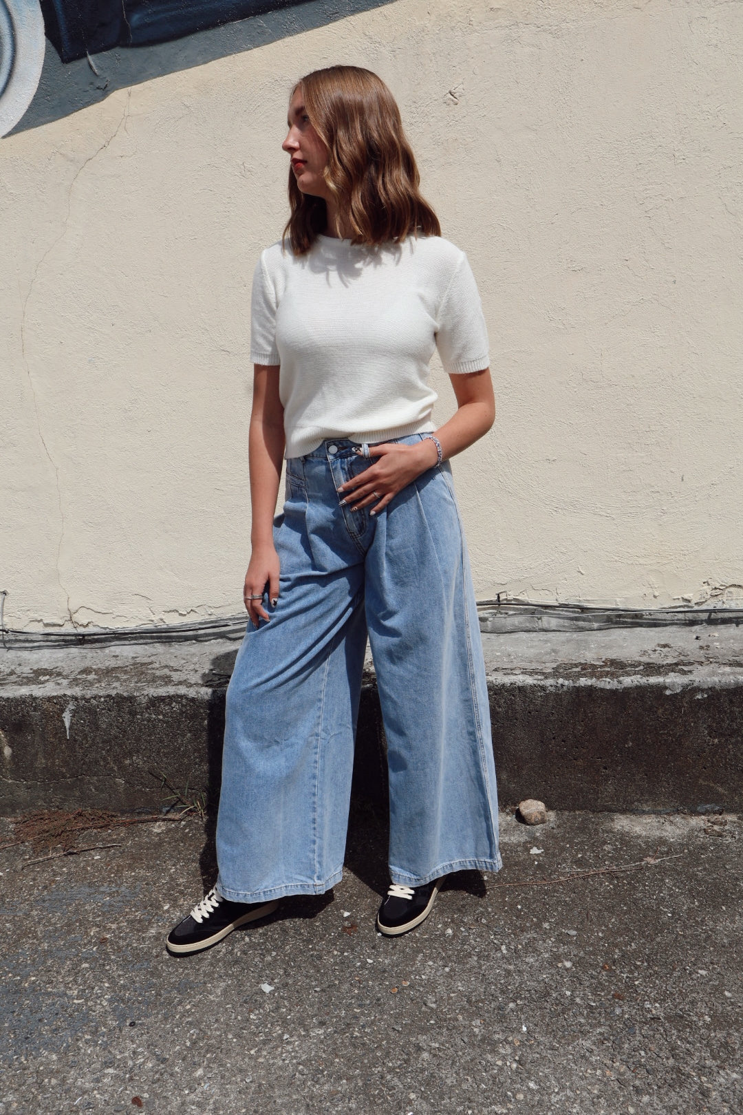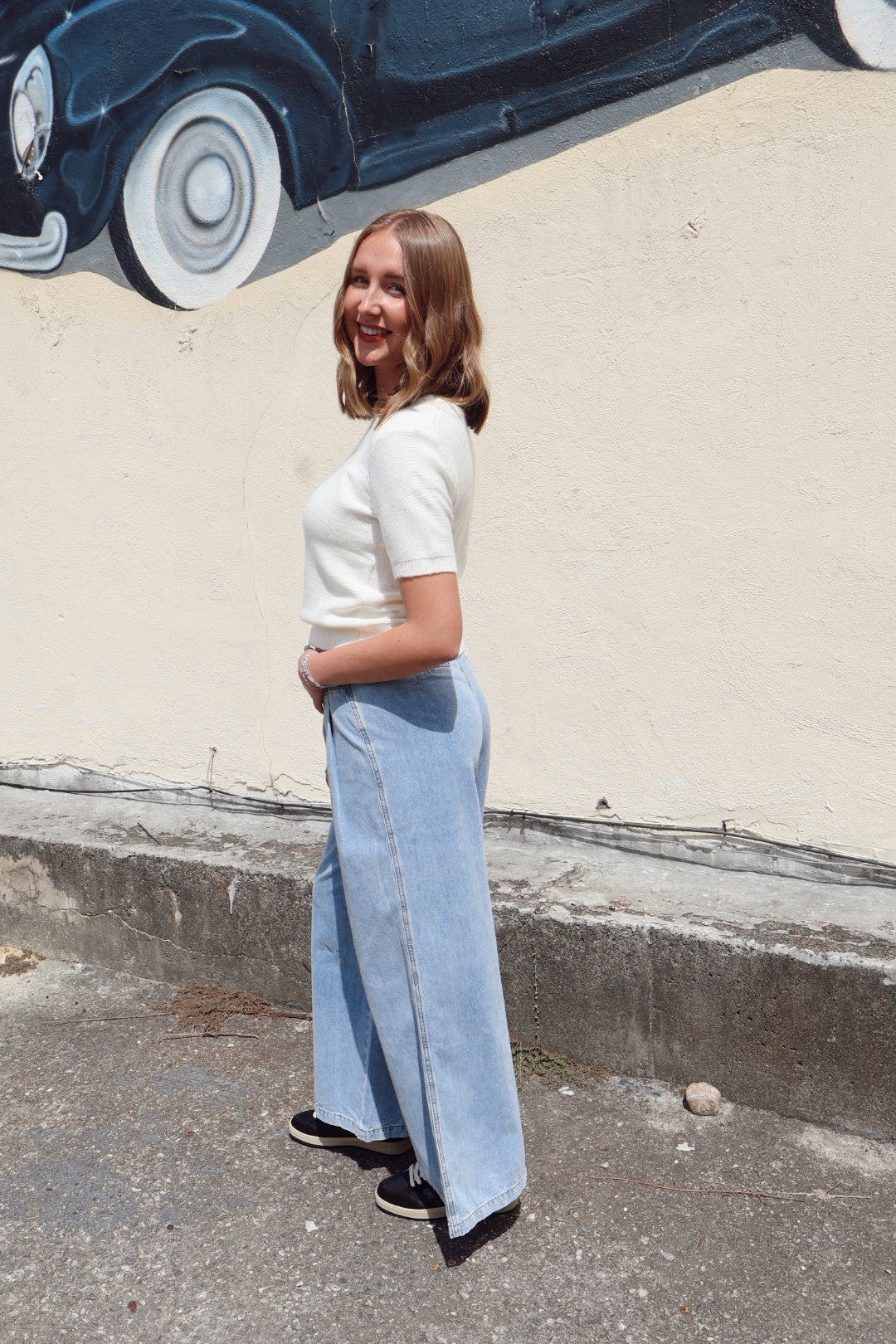 This off-white short sleeve crewneck sweater offers a versatile and elegant look. Its soft fabric provides comfortable wear, making it perfect for layering or standalone use. The neutral ivory hue pairs easily with various outfits, adding a subtle touch of sophistication to your wardrobe.