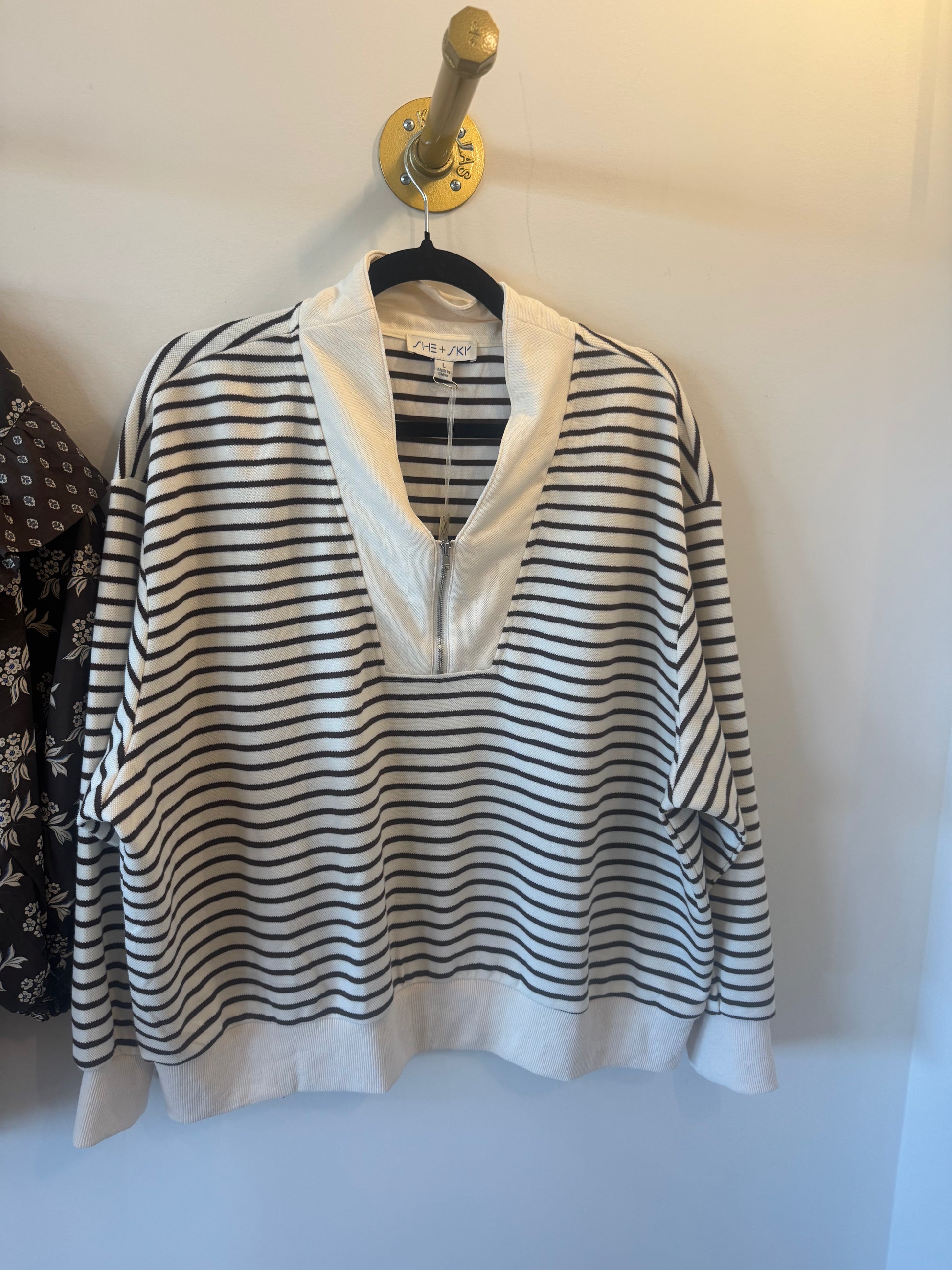 This long sleeve half zip stripe sweatshirt combines comfort and style effortlessly. Crafted with soft, breathable fabric, it features a classic half-zip design that allows easy layering and adjustable ventilation. The subtle stripe pattern adds a refined touch perfect for casual outings or relaxed days at home. Designed to keep you warm without sacrificing mobility, itโs an ideal addition to your wardrobe for a cozy yet polished look.