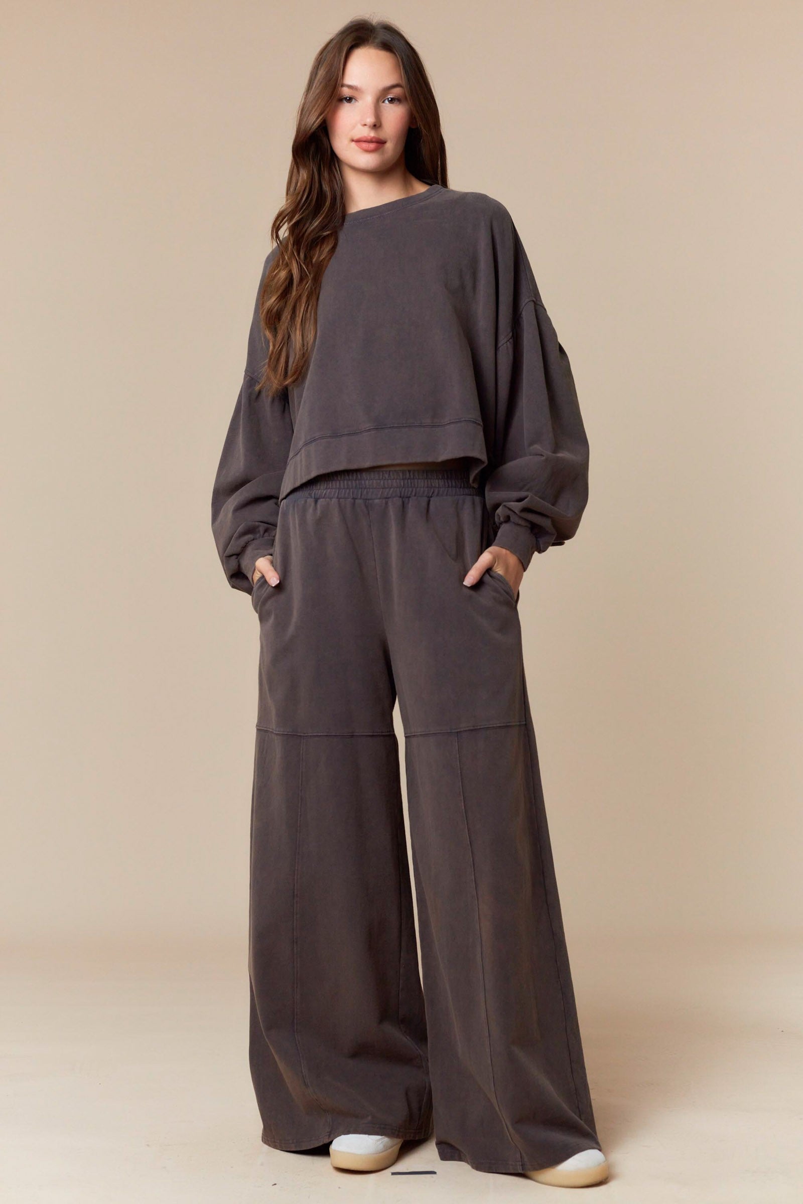 Elevate your casual wardrobe with the Washed Brown Set, featuring a sweatshirt designed with a unique washed finish and cut edge ruffle hem detail. This set combines comfort and style effortlessly, offering a relaxed fit with added texture for a fashionable twist on everyday wear. Perfect for lounging or casual outings, it brings a cozy yet chic vibe to your look.